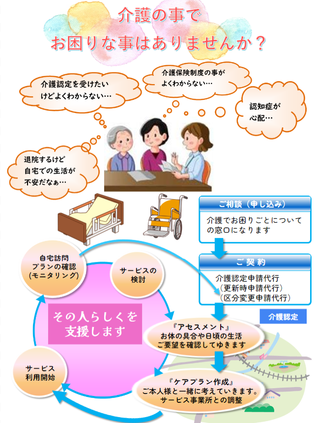 介護支援専門員は、「介護保険法」に規定された専門職で、居宅介護支援事業所や介護保険施設に必要とされている宿主で、一般にケアマネジャー(略してケアマネ)とも呼ばれています。 ケアマネはご利用者様からの相談に応じ、その心身の状況等で各種サービス事業者との連絡調整等を行い、ご利用者様が自立した日常生活を営むのに必要なケアプランを提案させて頂いています。