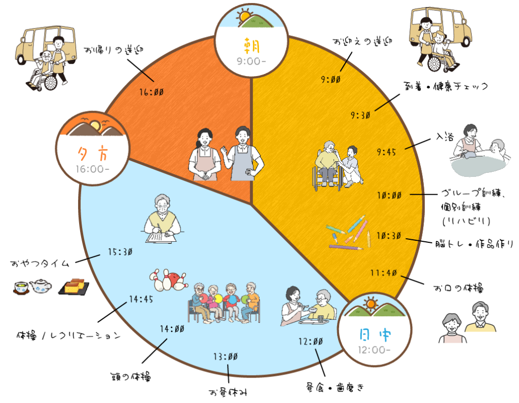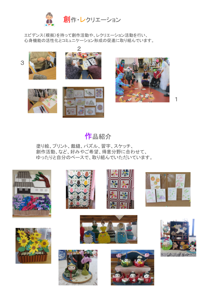 食事・入浴・健康チェックをはじめ、楽しく体を動かしたり、作品作りの創作活動やレクレーション、いろいろな活動を通して気の合う仲間作りの機会なども提供しています。